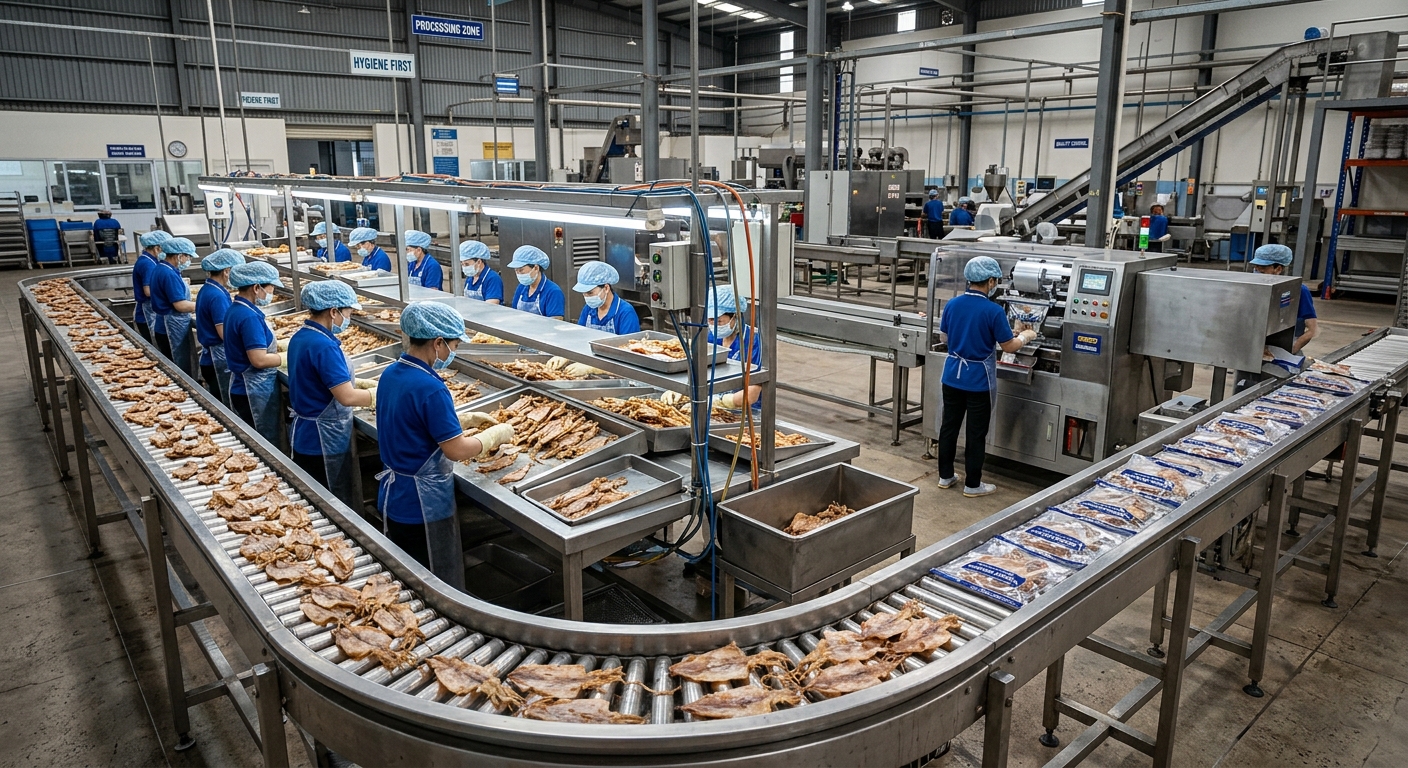 Nhà máy Tiến Trang tọa lạc tại Long Hải — vùng biển giàu nguồn mực nguyên liệu. Với diện tích 5,000m², nhà máy được trang bị dây chuyền chế biến mực khô tự động, phòng sấy khô kiểm soát nhiệt độ, và hệ thống đóng gói đạt tiêu chuẩn xuất khẩu.
